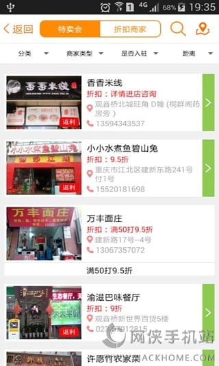 2、软件全面展示商家的信息,提供城市(区县)选择,行业类别选择;