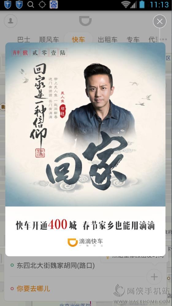1、拼车回家,小编推出的是滴滴出行app,顺风车的页面已经打出温馨的“快团圆”广告;