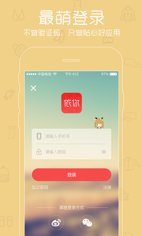 依你下载手机版app:是一款基于购物基础上的综合性软件,让败家的你不再败家。看到任何心仪的商品,将它收藏到你的收藏夹中,拒绝购买。只静静地欣赏欣赏就够了。还能和你的小伙伴们分享你的收藏夹哦!