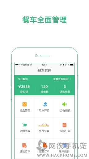 4、支持商品上架、下架、库存管理;支持APP在线采购原料;在线管理账目收入、账期结算;编辑专属公告,与用户更好的互动。