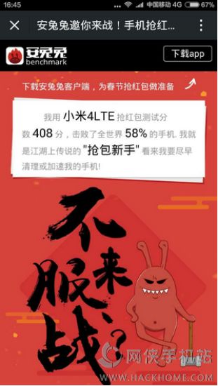 按照安兔兔的说法,在进行加速前,手机抢红包测试的分数为313分,只击败了35%的手机;在进行加速之后,手机抢红包的测试的分数为408分,能够击败58%的手机。