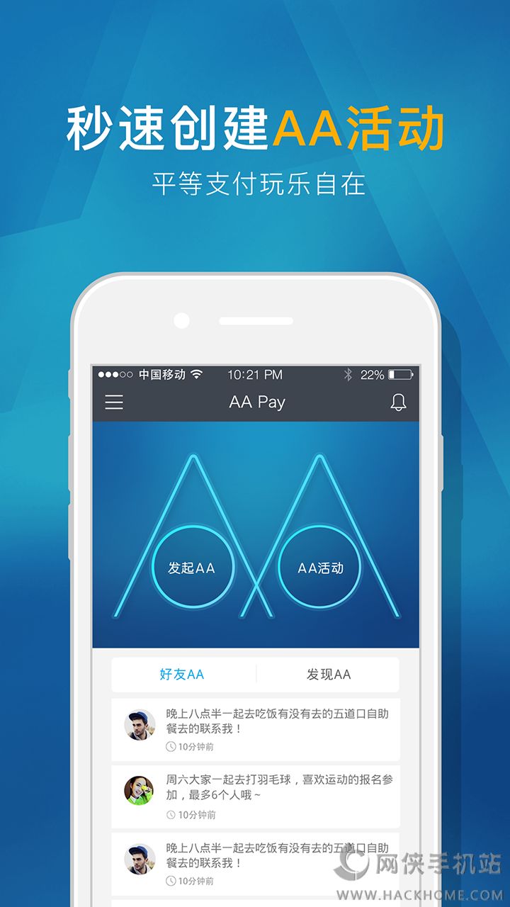 4、AA派基于AA活动连接你我,用时尚的支付方式,帮助避开人际交往中的尴尬局面。从发起活动时的先付款和后付款选择,到结算时的平均AA和狗屎运随机金额支付,每一个环节都体现着AA派的精神;