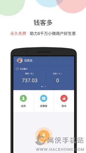 1、钱客多,旨在帮助小微商户轻松实现手机收款与会员营销;