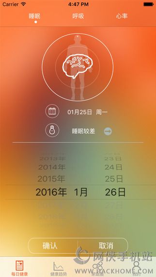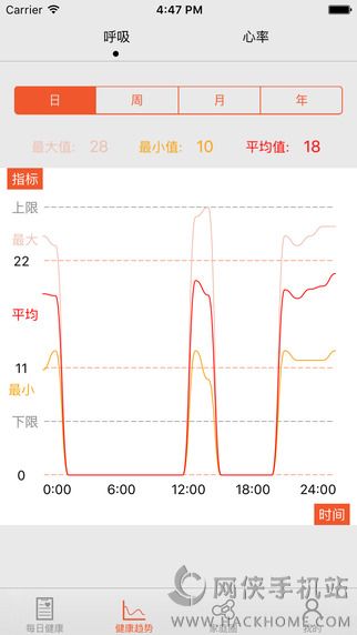 2、通过app,用户绑定设备后可以全天候查询自己的呼吸,心率,睡眠等健康状况,以及长期的健康趋势,有异常情况应用会及时推送通知,让用户时刻了解自己的身体状态;