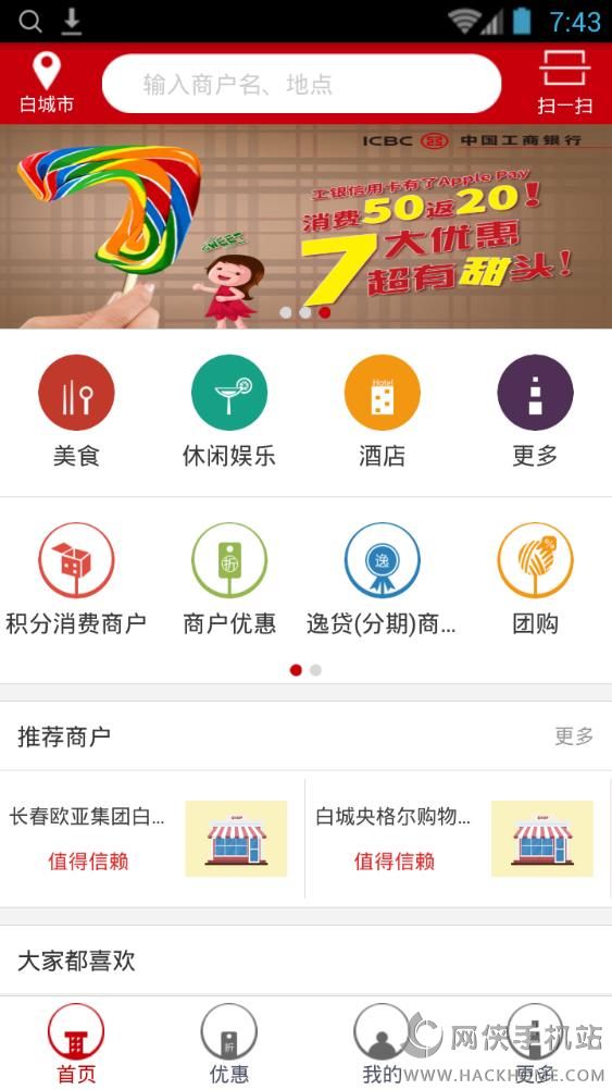 2、消费折扣优惠:提供团购消费、商户优惠消费、工行卡优惠、电子券抵扣等多种优惠消费方式;
