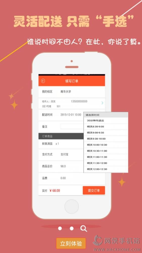 3、每个学校为一个配合点,本APP以30分钟内送货到手为快捷的服务理念、物美价廉的产品赢得广大学生的深度喜爱。