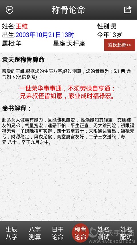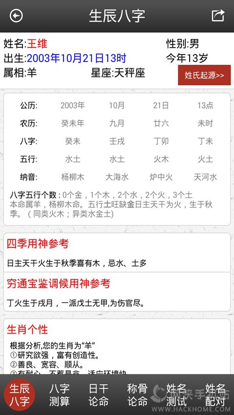 5、生辰八字、八字测算、日干论命、称骨论命、姓名测试、姓名配对、姓氏起源等;