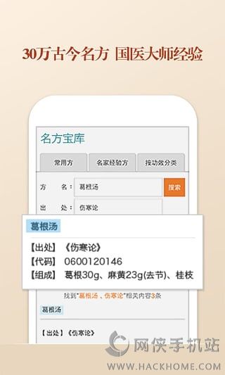 3、珍贵方剂:收录了30万古今珍贵方剂、国医大师独家经验秘方,提供高级搜索查询、国家方剂编码查询;