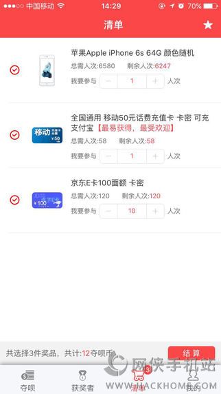 2、奖品种类丰富:从高富帅的数码产品、苹果iPhone6s等到日用消费产品、中国移动联通电信手机话费充值卡、京东E卡、淘宝购物卡等,总有您想要的;