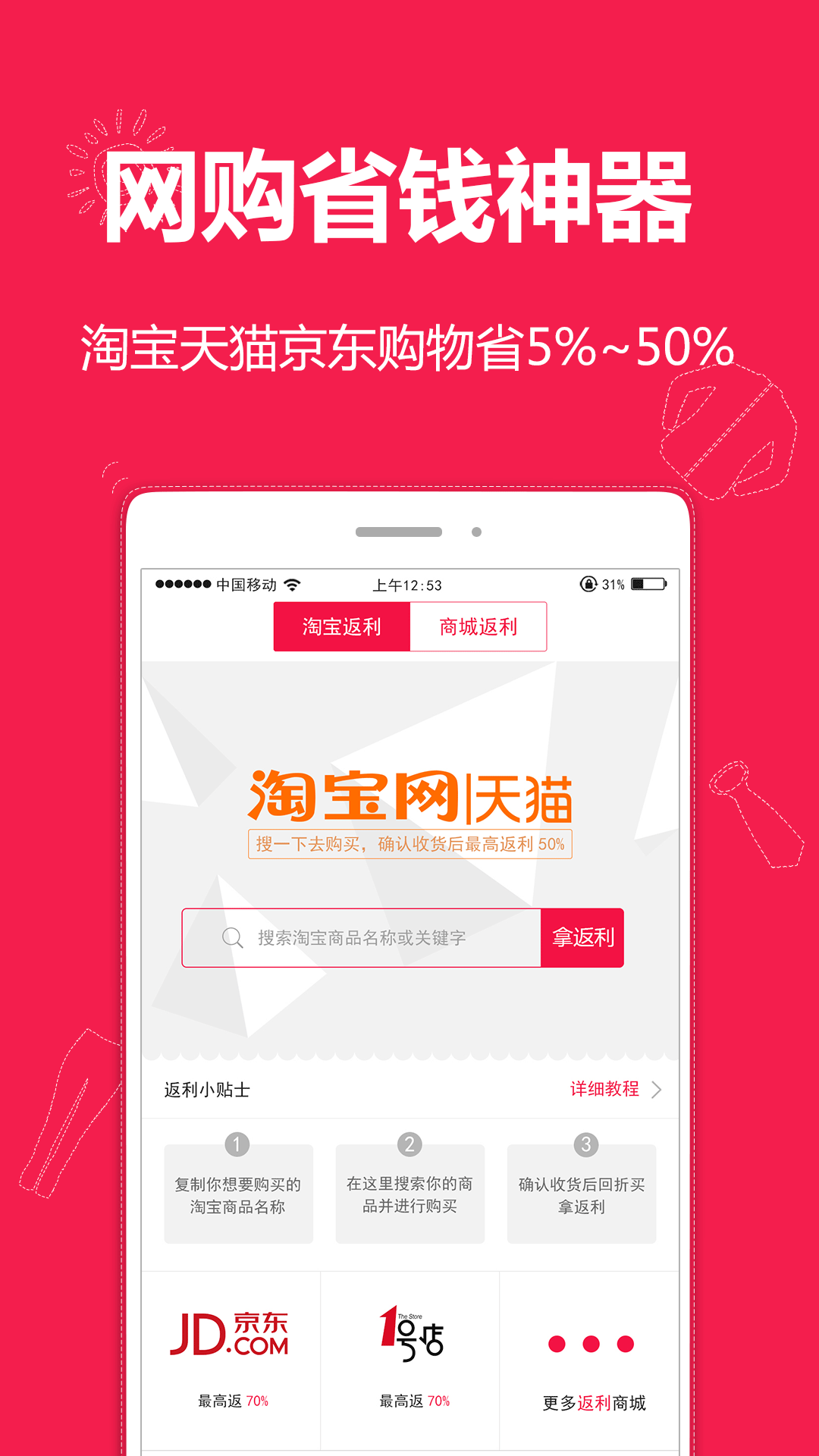 1.淘宝返利比例高达95%,返现省钱比例遥遥领先其它返利APP。