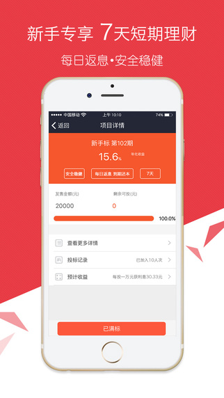 1、新手标:定期理财产品,七日预期年化收益率15.6%(仅限首次投标新用户专项一次);