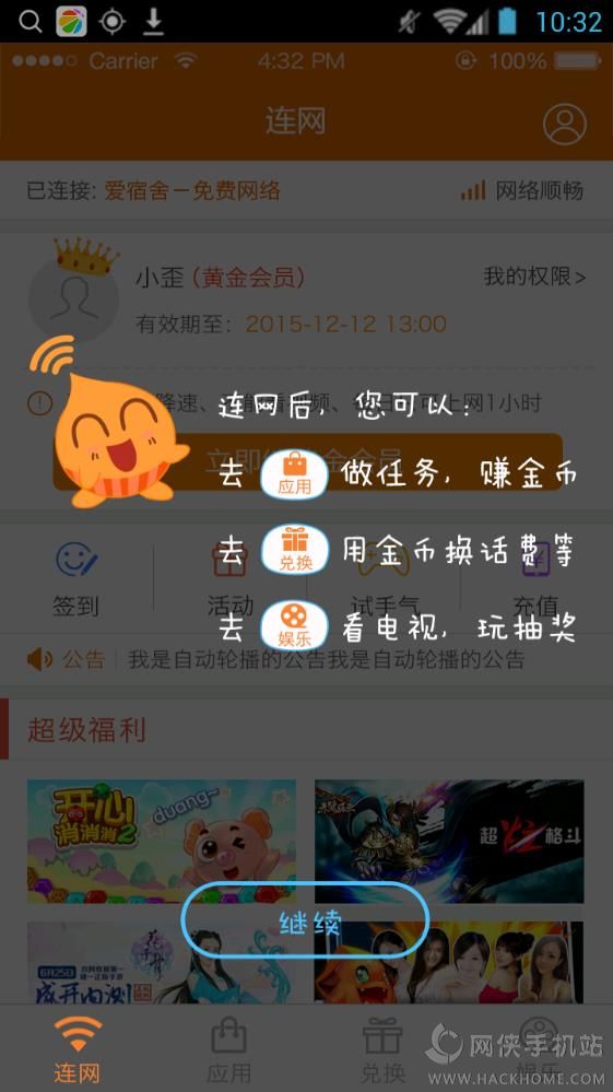爱宿舍免费wifi下载手机版是一款可以免费连接无线的客户端应用,这里用户可以一键连wifi,随时随地畅快上网,不用担心流量问题,并且还可以通过完成任务赚取金币,兑换奖励,非常划算哦!快来下载体验吧!