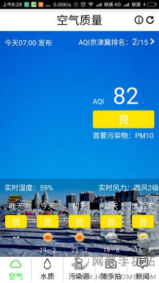 6、APP还加入了许多便民功能,如最近五日内的天气和空气质量预报、主要污染物实时浓度、湿度、风力、以及活动指数,以此来判断空气质量是否适合外出活动、是否对身体健康有影响;