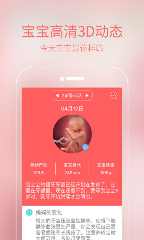 2、宝宝动态:280天每天呈现宝宝动态视频,模拟真实B超图像,清楚了解宝宝发育,陪宝宝一同成长;