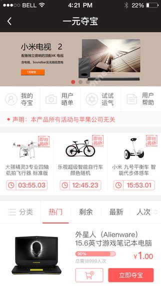 1、一元夺宝,是一个激情的众筹购物平台,在这里,每天都有N多人用1块钱买到了自己想要潮流新品;