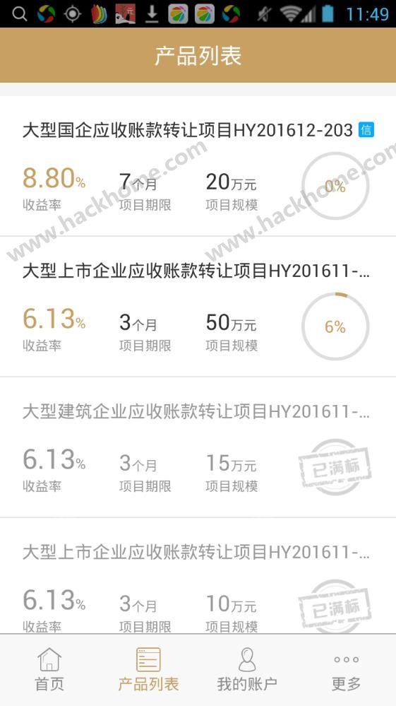2、产品列表:展现所有定期理财投资项目列表和转让中的债权列表,可进行投资;