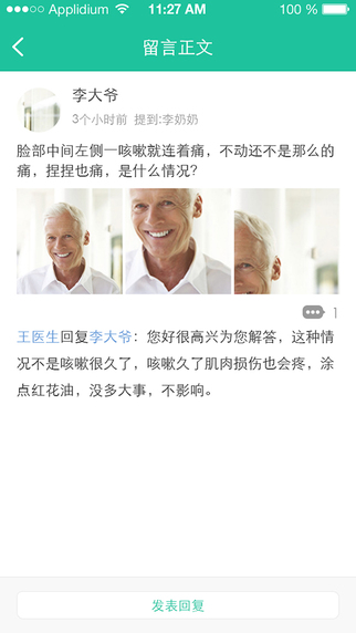 3、通过app,老人和家属可以实现与医护人员的在线咨询、查看咨询记录;