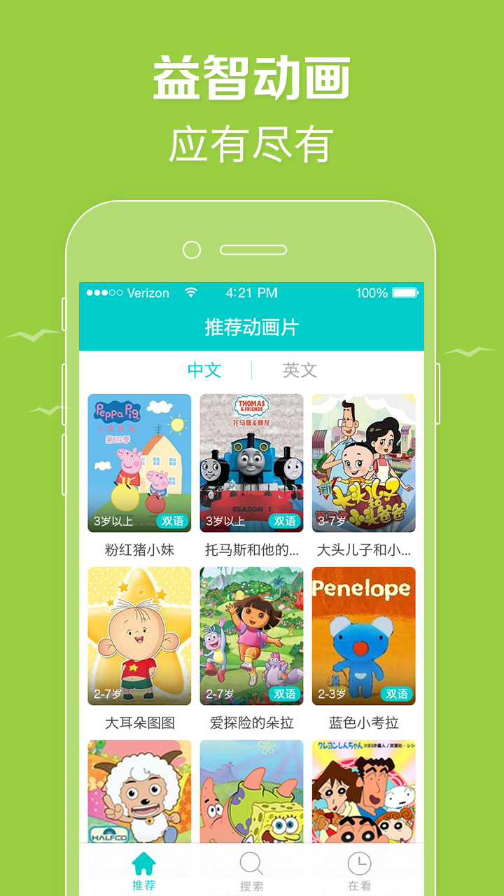 3、我们精心收集广受欧美家庭欢迎的经典动画片,寓教于乐,潜移默化中培养儿童的知识和能力,包括创造力、记忆力、数学、逻辑推理、积极乐观和礼貌尊重等十一项核心能力,并为孩子创造纯正英文环境,轻轻松松完成英语启蒙。