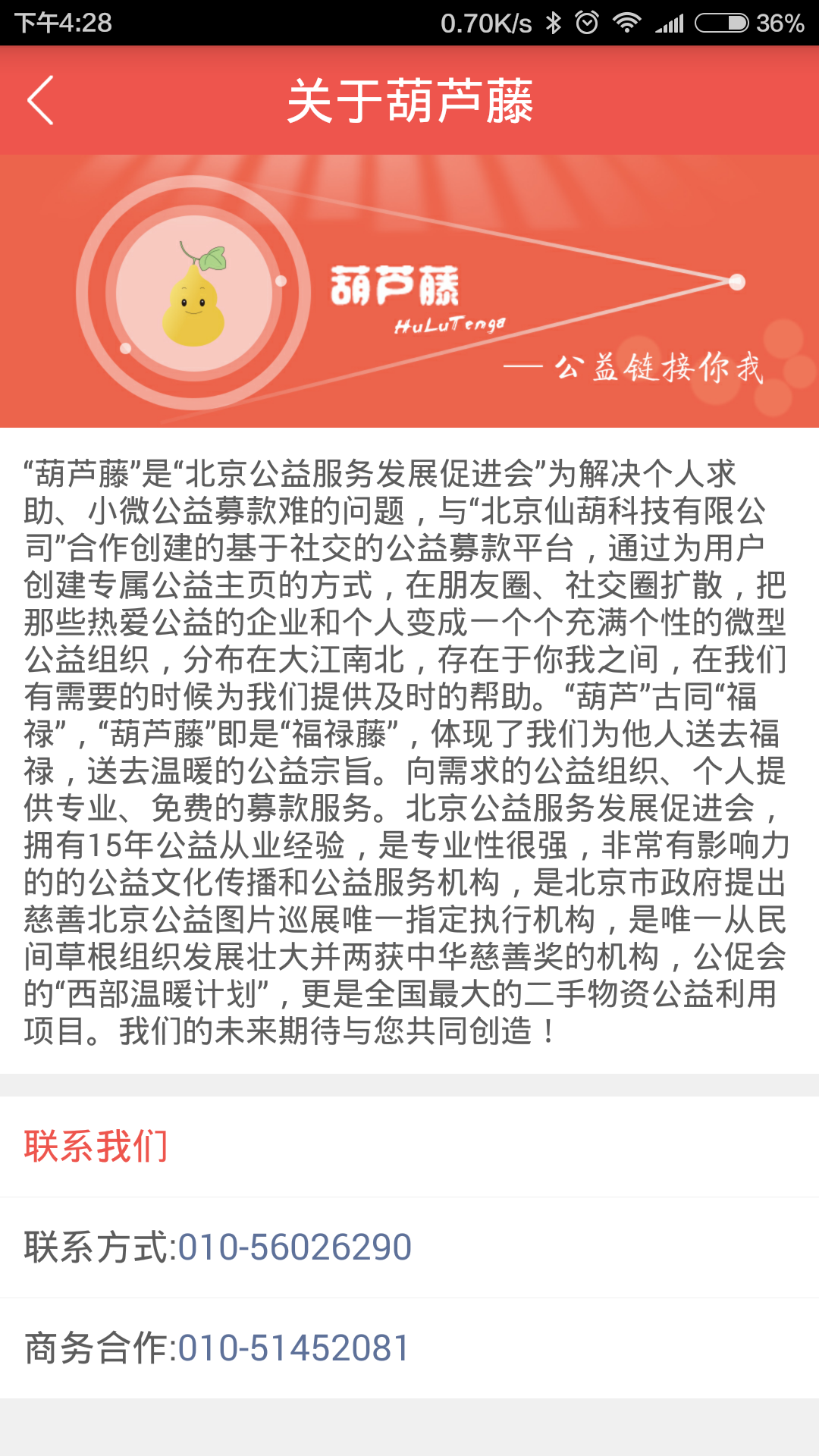 1、上线说明:此版本为最简功能正式版本,包含有个人资料、推荐募款、公益主页等功能,能够实现浏览公益项目并完成捐赠葫芦藤app是北京仙葫科技有限公司推出的公益移动平台,是葫芦藤公益的手机app;