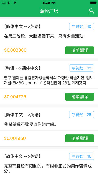5、具有语言翻译能力的用户可在该平台注册并通过测试成为兼职译员,通过翻译词条赚取佣金;