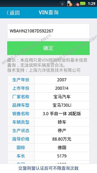 1、VIN查询:路上检查发现套牌、改装、走私嫌疑车辆,先校验并查询一下VIN车架号吧,可以查询该VIN对应的具体车辆品牌和车型;