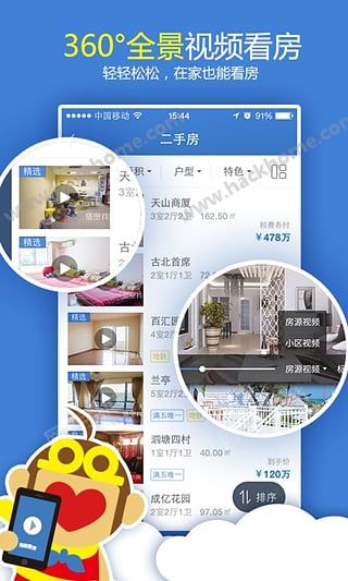 3、【个性选房】:360度全景视频看房,体验身临其境的感觉,足不出户即可看遍中意房源;