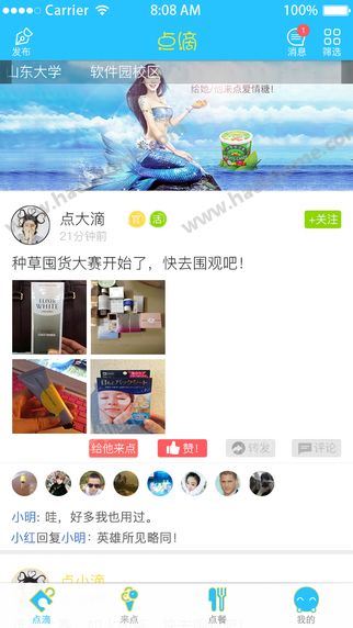 4、点滴校园app有跨境电商、世界各国零食、化妆品、日用品加入进社区;