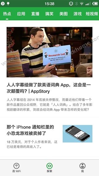 7、自带新鲜热辣的精华内容,让你享受橘子娱乐、好奇心日报、知乎日报等应用的优质内容。