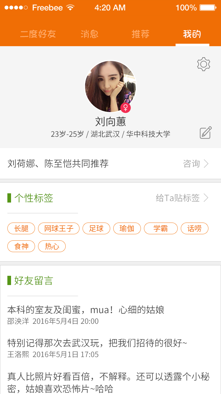 2、领先的二度好友推荐机制,帮你靠谱找对象:基于手机通讯录,推荐好友的好友,帮你找对象。好友推荐、好友评价、咨询好友,三位一体,全方位了解你的意中人,更靠谱,更放心;