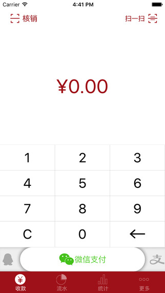 1.一键收款,支持微信扫码支付、微信付款码收款方式;