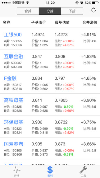 2、套利行情-包括合并(折价)套利,分拆(溢价)套利,下折套利;