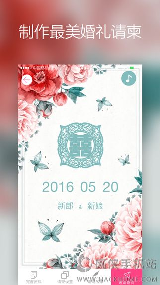 3、新人婚礼请柬:创建两个人的婚礼主页,拥有专属婚礼域名,将我们的故事永远在这里保存!马上分享请柬,把我们的婚礼消息传递给朋友吧;