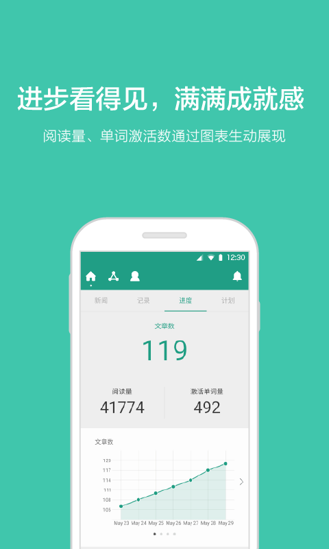 4、特别的,扇贝新闻可以记录你每天的学习进度,包括完成的文章数,被激活的单词数,将你日积月累的进步通过图表生动的展示。