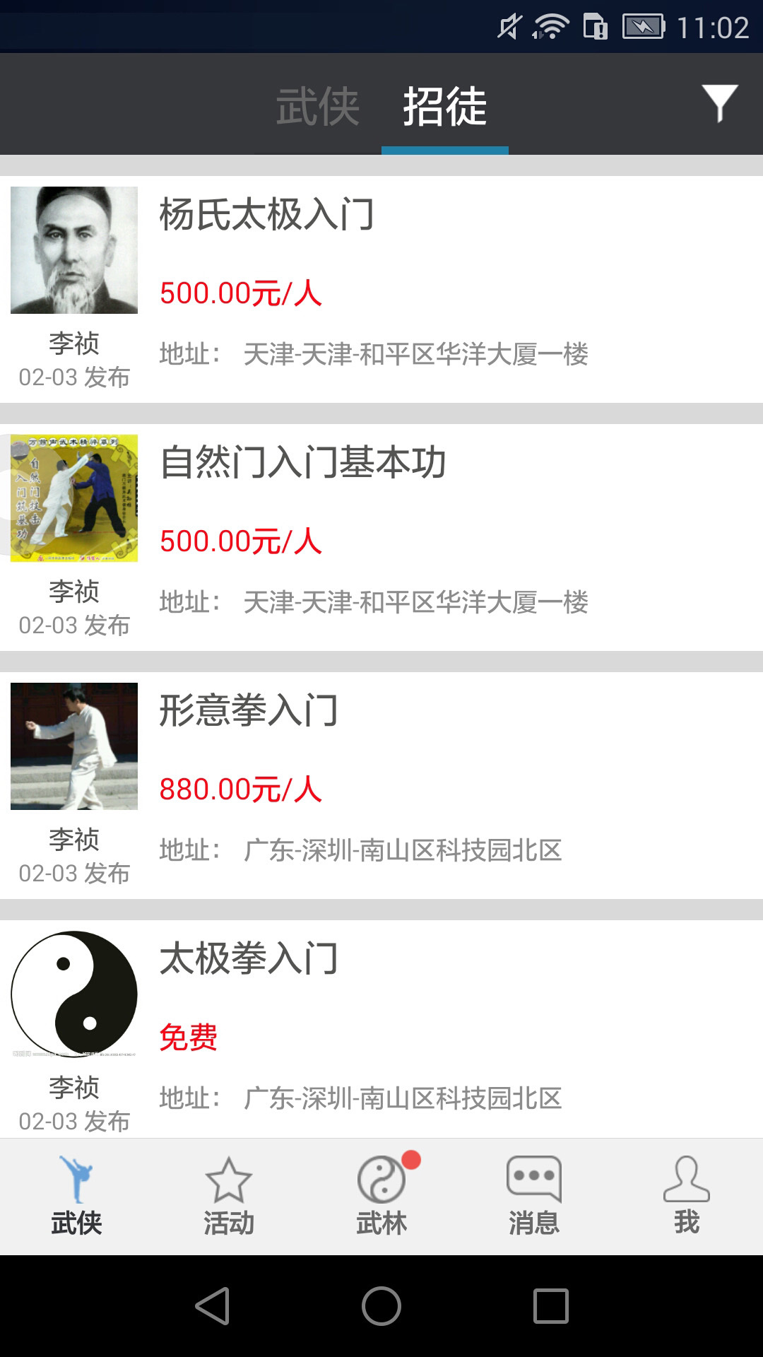 1、武林汇为武术爱好者提供拜师招徒、活动交流、赛事训练、武术社交、招聘就业等功能的应用;