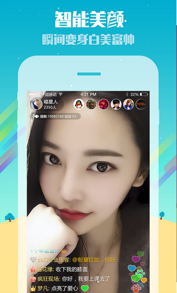 1、【特色才艺】脱口秀、潮音乐、舞蹈、K歌、竞技、酷玩户外.....嗨翻直播,等你来翻牌。 2、【智能美颜】一键智能美颜,秒变男神女神,让你任何时候都是美美哒! 3、【浪漫礼物】点亮爱心,礼物嗨翻天,炫酷duang~duang~ 4、【视频秒开】流畅体验,传递实时高清画质,告别卡顿,不错过心仪主播每一个美好瞬间。 5、【尽享尊贵】华丽座驾、进场动画、富豪等级,高大上的视觉享受,秀出你的范儿。