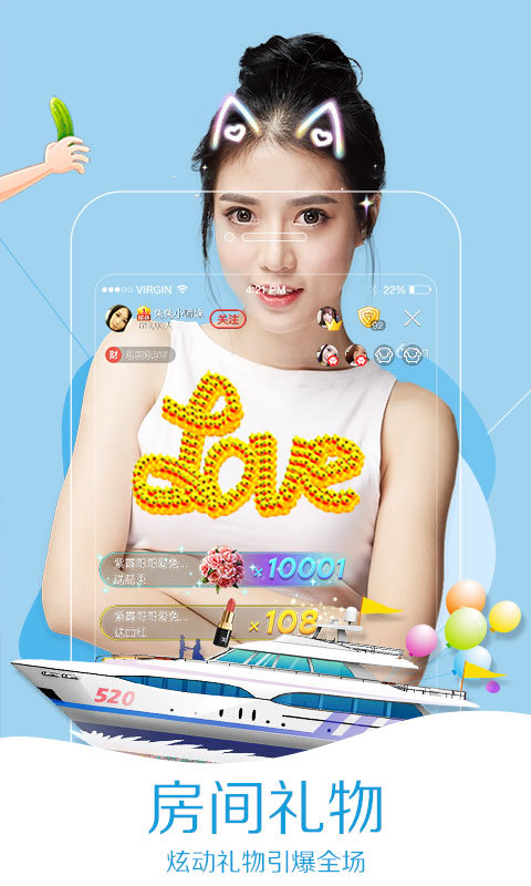 1、【主播云集】 清新校园风,萝莉萌妹子,知性文青范,搞笑逗咖达人秀,总有一个让你怦然星动。 2、【直播交友】 表爱慕,送么么、送礼物、做管理、做粉丝、花样示爱,让心仪蜜桃主播不再遥不可及。 3、【惊喜活动】 精彩纷呈的各类活动,丰富多样的豪礼大奖,让您惊喜不断,趣味常伴。 4、【酷享尊贵】 享尊贵,酷炫座驾、进场动画、富豪等级,分分钟扮炫酷享尊贵!