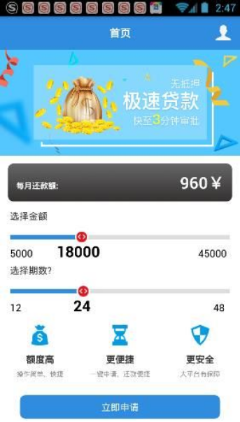 1、极速贷款:多种贷款机构,方便用户借钱、借款、贷款,小额贷款实现当天审核,当天放款。 2、征信服务:通过大数据分析技术智能匹配您的征信。 3、产品多样:由贷款机构和金融机构提供丰富的借贷产品,信息安全可靠。 4、操作简单:这是一个实现手机贷款,网贷分期,让小白也能借钱的网贷平台。