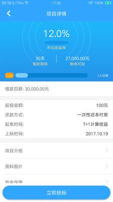 1.专业风控,保障用户收益; 2.起投金额低,百元理财高收益,预期年化收益高; 3.产品种类多,投资多灵活,助力优化资产配置比; 4.法律保障:投资者在UU理财上购买的任意理财产品都能自动生成一份拥有私发效力的电子合同,严格遵守国家法律法规,切实保障用户隐私,未经用户同意,决不纰漏个人信息。