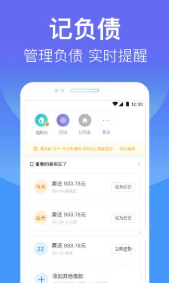 1、一键还款,续期还款,想方设法降低您的还款压力; 2、到期提醒,逾期提醒,贴心提醒维护您的网络信用; 3、银行卡、支付宝、微信、银行柜台转账,多种方式满足您的还款要求。