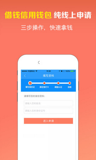 1.借钱相当快速度,随时线上申请,2小时到账,随时解决你的任何资金问题! 2.一千元起步,没有上线的贷款APP哦! 3.支持多种人群,只要有身份证就可以哦!