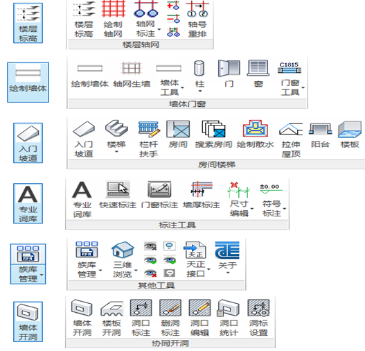 TR天正建筑软件整合了BIM建模软件的主要功能,以模块划分为七个选项板呈现在界面上,方便用户使用。