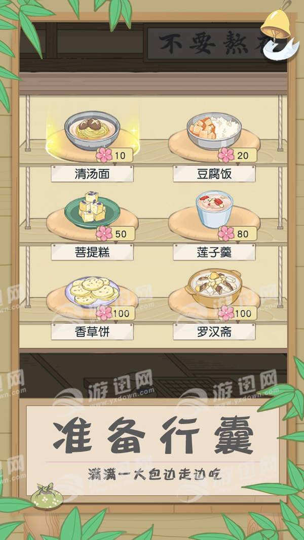 “旅行小光头”的玩法里,玩家进入到院子,准备饭、工具和开运的物品,小和尚就可以自由地出门旅行,无需更多操作。