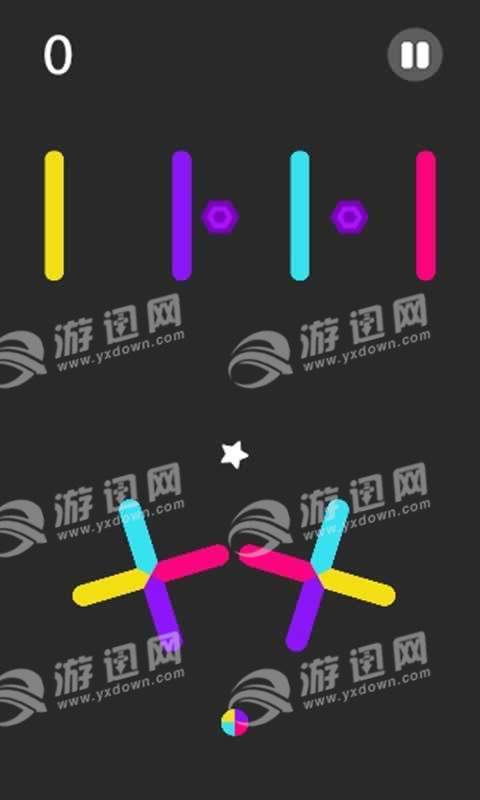 小球只能通过颜色相同的障碍,一旦撞上颜色不同的障碍游戏就将失败。