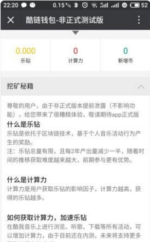 4、并且有幸运币产生,在酷我音乐上进行浏览、听歌、下载等所有活动,可以增加计算力,由于目前还在内测期间,先占个坑,先挖矿,等APP正式版。