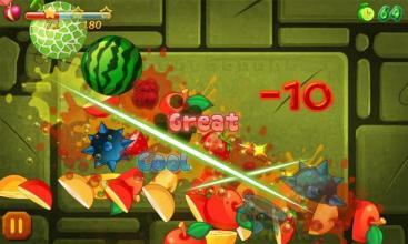 按住手指在你的手,扫在空中向着水果切开,得到的分数。当你切到一个炸弹,你将失去你的一部分分数,并有特殊的爆炸效果。玩的时候有时间限制,如果你错过了机会就再试一次,完全都是免费的,。请保持你的清醒头脑,不要恐慌。