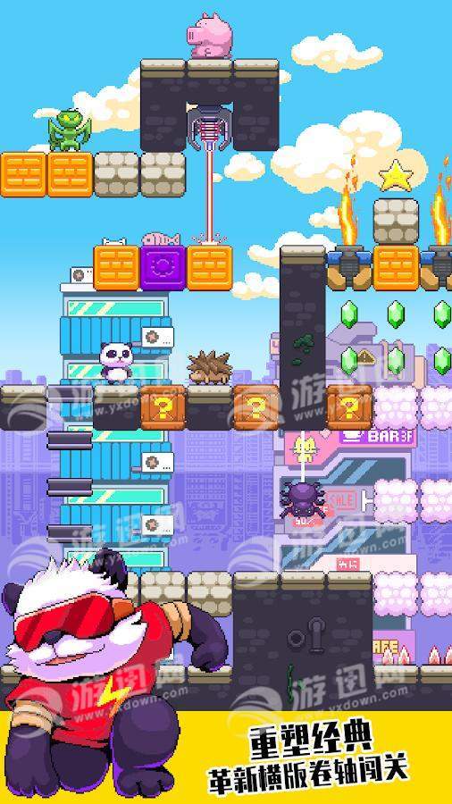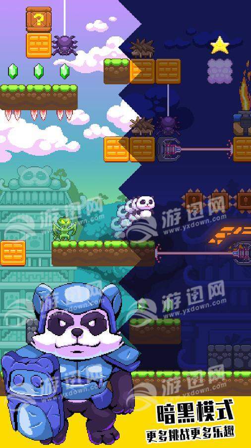 超级熊猫侠(PandaPower)是一款以熊猫为主角的像素风横版闯关游戏,游戏延续了经典的横版卷轴挑战模式,玩家需要点击屏幕来控制熊猫侠,不断跳跃和移动,探索充满异域风格的关卡地图,迎接更加具有挑战性的暗黑模式,快来下载试试吧!