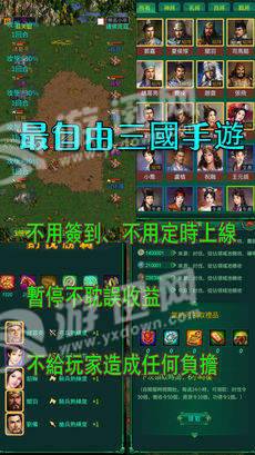 这是个减压、放松、养生型三国手机游戏。本游戏不需要花很多时间,没有像上班一样的日常任务,也不需要每天登录游戏。想玩的时候玩一下,不想玩的时候,即使一段时间不上线,也不会影响游戏收益。