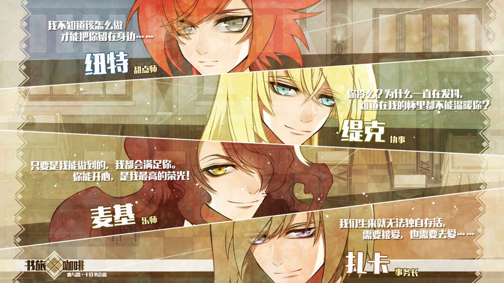 暖阳斜照的窗前,细细品味一杯浓醇的咖啡,轻咬一口微甜的姜饼,手抚着已泛黄的书页,耳边是悠缓的乐音……在这样富有情调的咖啡馆,还有他,与你携手……《书旅×咖啡》,在这里,与他们,与他……一起创造只属于你们的小小世界……这里是梦想之地,是治愈之地,是爱恋之地……方寸之间,蕴藏无限……献给这样的你——喜欢咖啡的你喜欢阅读的你喜欢装扮的你喜欢收集的你想被治(致)愈(郁)的你你们的故事,将由你来左右结局在书中,和他们一起尝尽所有的甜蜜和悲苦。每一次的抉择,会将你们指引向怎样的路途,迎接怎样的结局……是幸,是悲,是乐,是伤……未至劲头,又怎能收获,爱……你们的咖啡馆和爱巢,将由你来一手打造不仅仅是咖啡馆,还有只属于你和他的私密房间。丰富的换装元素,完全的自由搭配,不为虚荣,只为,爱……