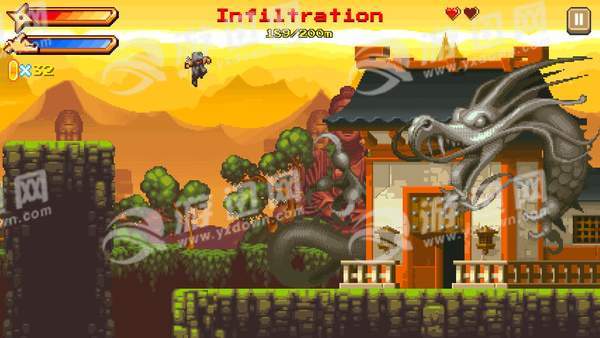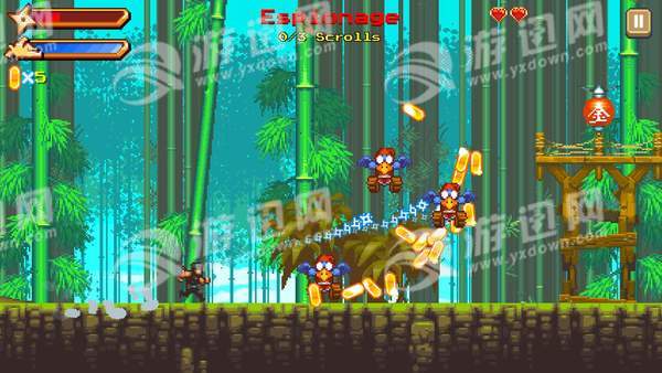 在像素风格的植物间迅速穿越,迅捷地消灭邪恶的敌人,跳跃到空中用手里剑击杀对手!