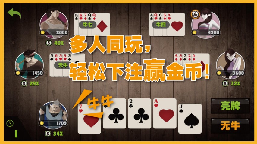 斗牛是一款游戏速度极快、极刺激的棋牌游戏。游戏可以有2人到5人同时进行,总共52张牌(除大小王)。在确定庄家后,系统将随机分给玩家每人5张牌,用户将根据5张牌进行排列组合,闲家一一和庄家进行大小比较决出胜负。